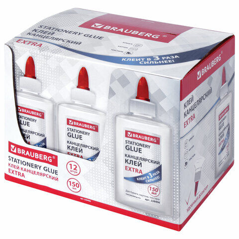Канцелярский клей Brauberg EXTRA, благодаря усиленной формуле, обладает повышенными клеящими свойствами. Узкий наконечник дозатора обеспечивает удобное и равномерное нанесение, а также экономичный расход клея. Клей не токсичен, безопасен и легко удаляется с одежды. Обладает устойчивостью к морозу и не имеет запаха. Съемный колпачок предохраняет от засыхания. Благодаря большому объему 150 мл клея хватит надолго. На водной основе.
