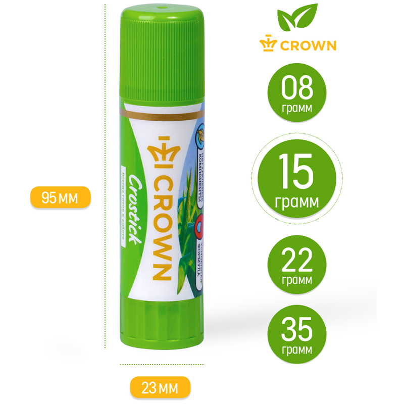 Клей-карандаш Crown легко наносится и равномерно распределяется на поверхности тонким и равномерным слоем и не деформирует обрабатываемый материал. Благодаря равномерному нанесению клей расходуется экономично. Подходит для склеивания бумаги, картона, ткани, фотографий, блесток и использования в различных подделках. Надежный колпачок предохраняет от высыхания в течение четырех лет.<br/>Клей-карандаш имеет особую гипоаллергенную формулу, в состав которой выходят исключительно натуральные компоненты - это кукурузного крахмал и вода, что безопасно даже для самых маленьких детей. <br/>Клей не имеет запаха, абсолютно безвредный, нетоксичный и легко отстирывается в холодной воде. Твори и создавай шедевры с клеем Crown.