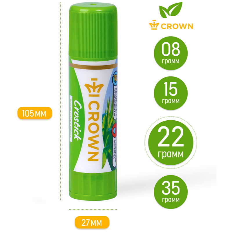 Клей-карандаш Crown "Expert", 22г легко наносится и распределяется на поверхности тонким, абсолютно прозрачным и равномерным слоем, не деформируя обрабатываемый материал. Благодаря равномерному нанесению клей расходуется экономично. Подходит для склеивания бумаги, картона, ткани, фотографий, блесток и использования в различных подделках. Надежный колпачок предохраняет от высыхания в течении трех лет.<br/>Клей-карандаш имеет особую гипоаллергенную формулу, в состав которой выходят исключительно натуральные компоненты - это кукурузного крахмал и вода, что безопасно даже для самых маленьких детей. <br/>Клей не имеет запаха, абсолютно безвредный, нетоксичный и легко отстирывается в холодной воде. Экспериментируй и создавай шедевры с клеем Crown.