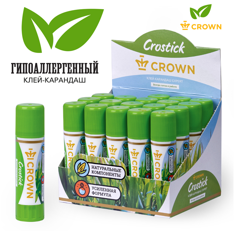 Клей-карандаш Crown "Expert", 35г легко наносится и распределяется на поверхности тонким, абсолютно прозрачным и равномерным слоем, не деформируя обрабатываемый материал. Благодаря равномерному нанесению клей расходуется экономично. Подходит для склеивания бумаги, картона, ткани, фотографий, блесток и использования в различных подделках. Надежный колпачок предохраняет от высыхания в течении трех лет.<br/>Клей-карандаш имеет особую гипоаллергенную формулу, в состав которой выходят исключительно натуральные компоненты - это кукурузного крахмал и вода, что безопасно даже для самых маленьких детей. <br/>Клей не имеет запаха, абсолютно безвредный, нетоксичный и легко отстирывается в холодной воде. Экспериментируй и создавай шедевры с клеем Crown.