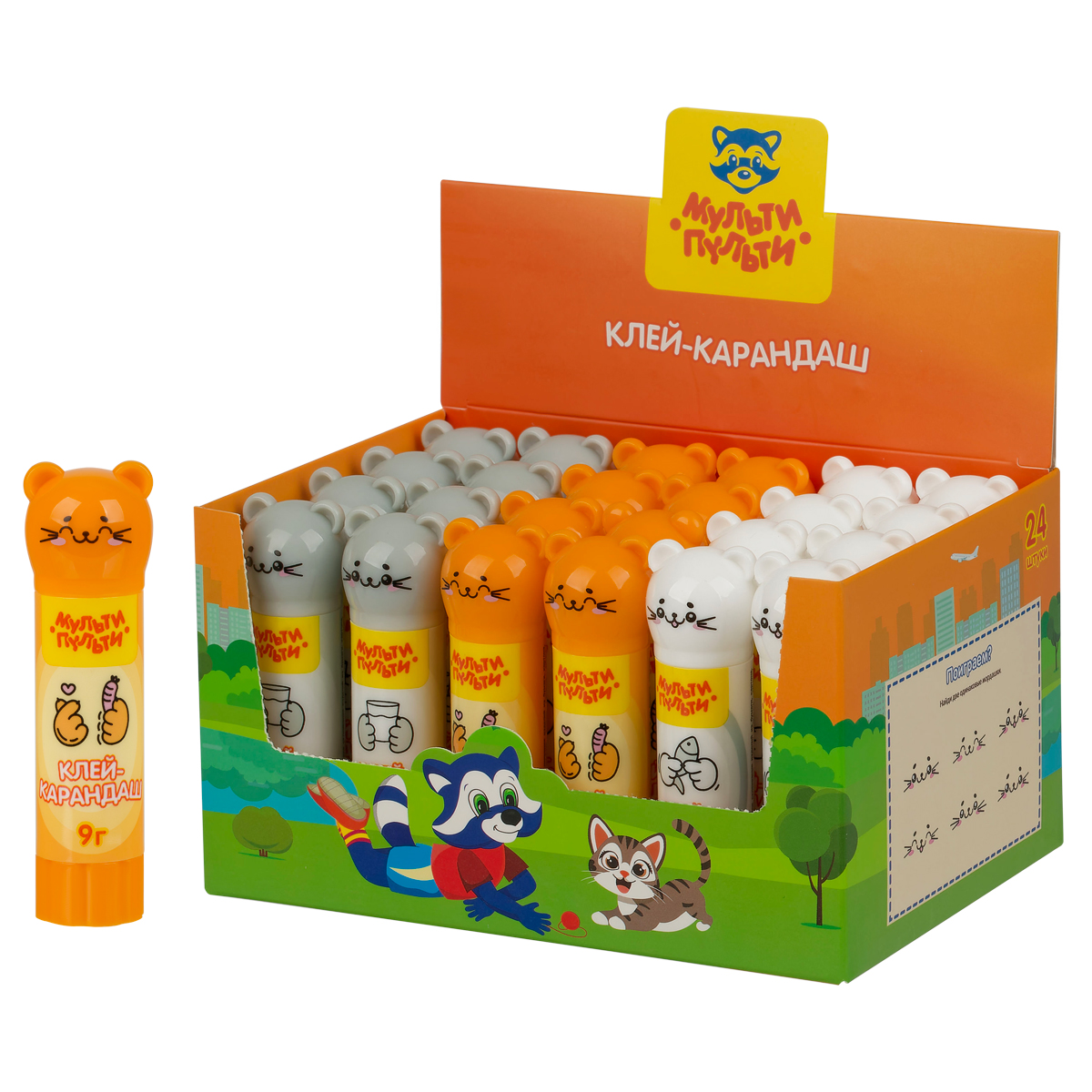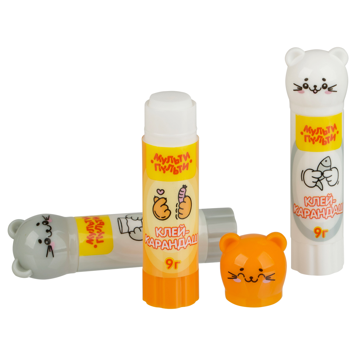 Клей-карандаш «Мульти-Пульти» «Котики» с фигурным колпачком – незаменимый помощник на уроках труда и занятиях творчеством. Улучшенная формула на основе ПВП позволяет хорошо склеивать изделия из бумаги, картона, ткани. Клей быстро сохнет, нейтрален по запаху, легко смывается водой, не токсичен. Состав не содержит растворителей. Экономичный расход позволяет заниматься творчеством каждый день. Колпачки в форме котиков подойдут для пальчиковых игр, поднимая настроение в процессе творчества.<br/>• Вес нетто: 9 г;<br/>• Назначение: бумага, картон, ткань, фотографии;<br/>• Основа: ПВП;<br/>• Форма корпуса: круглая;<br/>• Цвет клея: белый.
