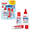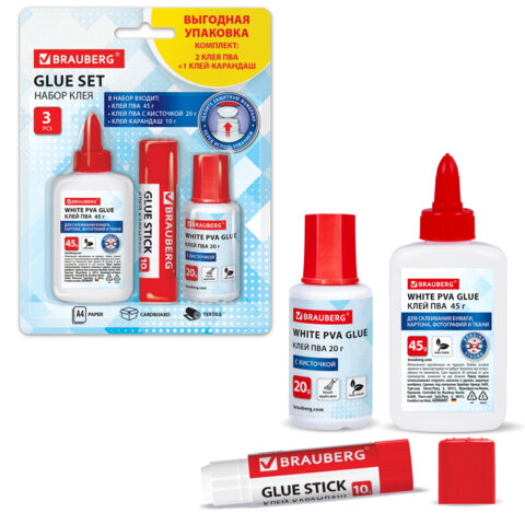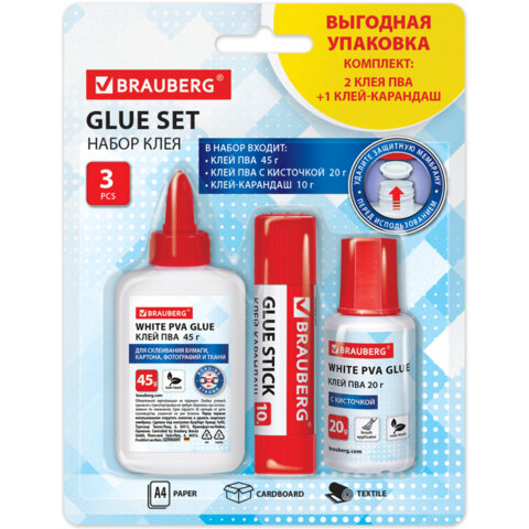 В набор входят: клей-карандаш 10 г на PVP основе, клей ПВА 45 г и клей ПВА 20 г с кисточкой. Клей-карандаш обеспечивает надежное склеивание благодаря PVP формуле. Клей ПВА подходит для качественного склеивания бумаги, картона, фотографий и ткани, легко смывается водой,; представлен в двух форматах: флакон с дозатором (45 г) и флакон с кисточкой (20 г) для точных и творческих работ. Перед первым использованием клея ПВА необходимо открутить дозатор и удалить защитную мембрану.