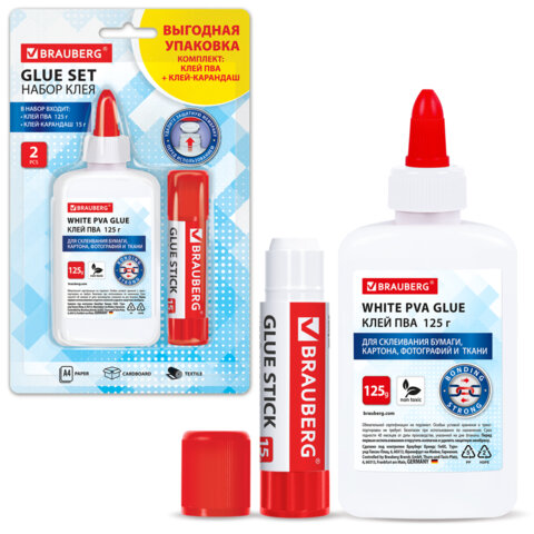 В набор входят: клей-карандаш 15 г на PVP основе, клей ПВА 125 г.