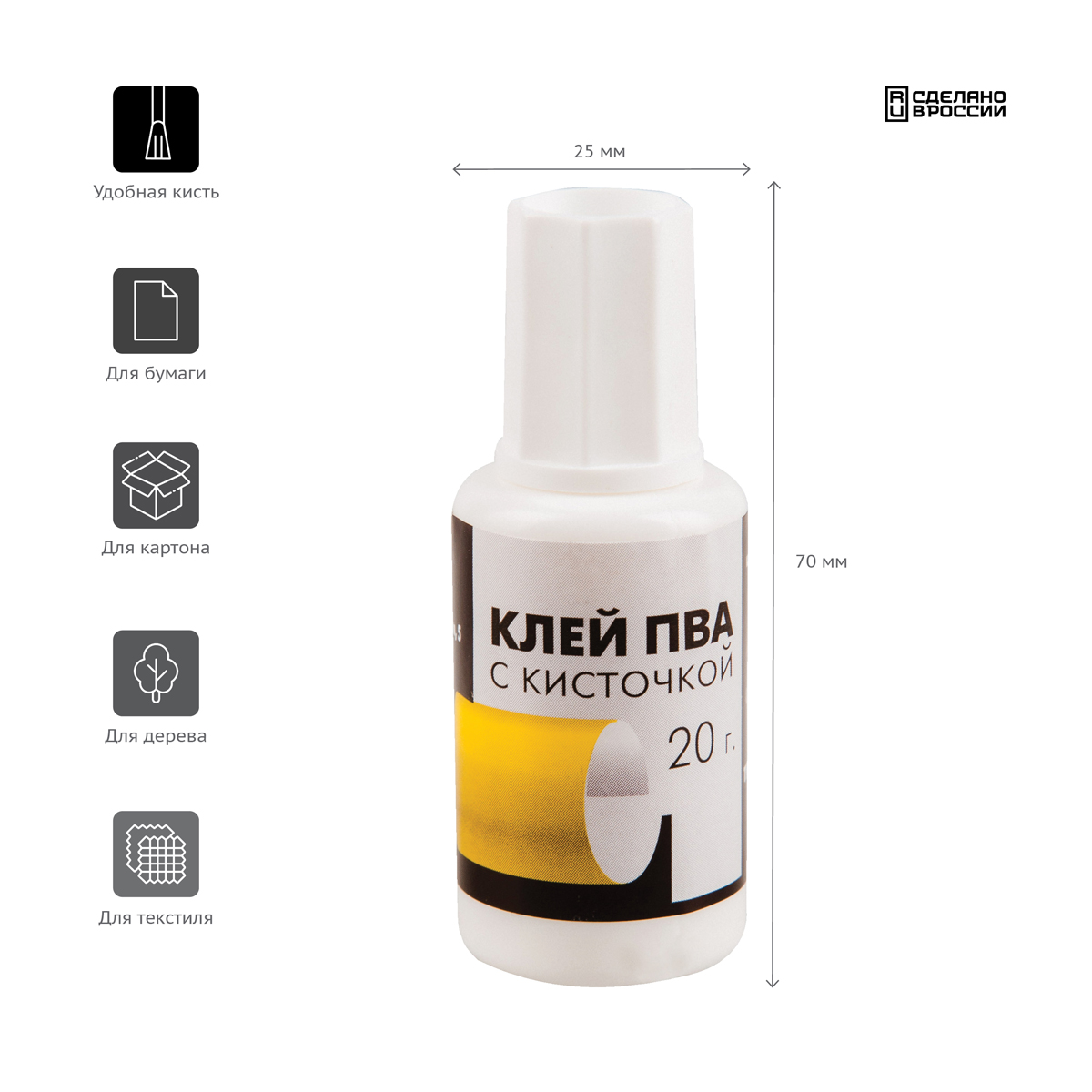 Клей ПВА легко наносится, клеит бумагу, картон, дерево, текстиль и кожу и не растекается в процессе использования, а бумага после склеивания не деформируется. Кисточка для удобного нанесения не теряет форму и не пушится даже после длительного использования. Отлично продходит для детей дошкольного и школьного возраста.