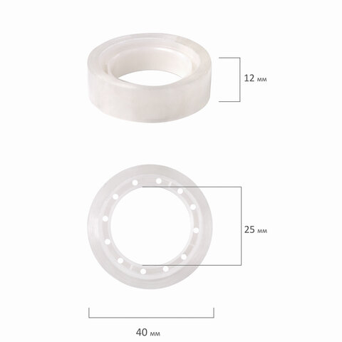Диспенсер снабжен стальным ножом для отрезания ленты. Подходит для канцелярских клейких лент любого типа шириной до 19 мм с диаметром сердечника 25,4 мм и длиной намотки до 33 м. Канцелярская клейкая лента имеет гарантированную длину 10 м и ширину 12 мм и обладает высокой клеящей способностью. Отличается прозрачностью и прочностью 35 мкм. Полуматовая. Упаковка — картонный подвес из 1 ролика.