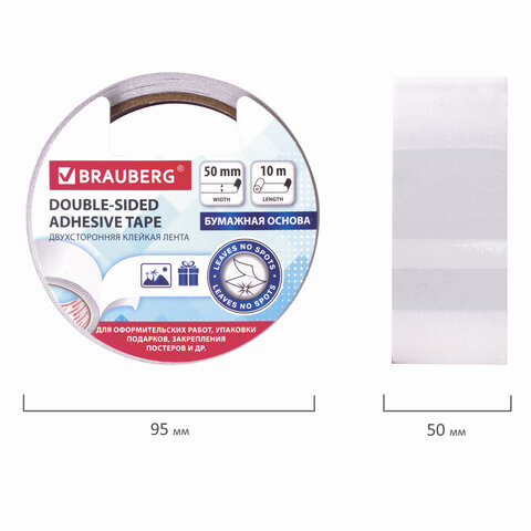 Двухсторонняя клейкая лента BRAUBERG на бумажной основе применяется для оформительских работ, упаковки подарков, закрепления постеров и других канцелярских нужд.