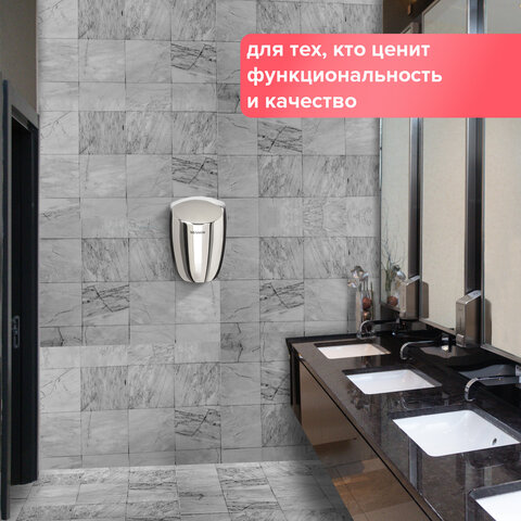 Мощность 1200 Вт обеспечивает время сушки рук всего за 15 секунд. Стандарт IPX1 гарантирует защиту от брызг. Включается и выключается сушилка автоматически при помощи инфракрасного сенсора. Эргономичный дизайн, надежная конструкция делают данную модель идеальным вариантом для мест с высокой и средней проходимостью. Корпус из нержавеющей стали обеспечивает долговечность и антивандальную безопасность устройства. В комплект поставки входит набор для крепления к стене.