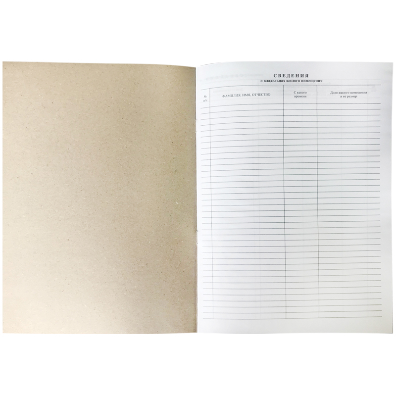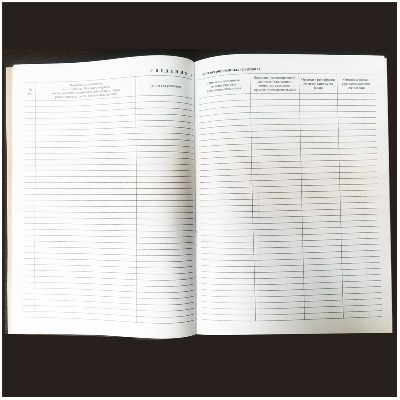 Домовая книга. Обложка - картон плотностью 200-220 г/м2. Внутренний блок -офсетная бумага 55 г/м2. Вид крепления -скрепка.