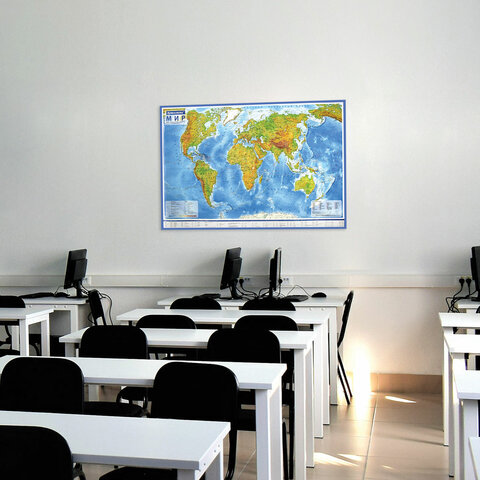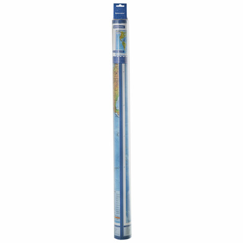 Настенная физическая карта мира с масштабом 1:25 000 000 обладает размером 120х78 см. Выполнена из ламинированной бумаги плотностью 170 г/м2. Поставляется в упаковке с европодвесом.