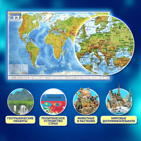 Карта мира физическая 120х78 см, 1:25М, с ламинацией, интерактивная, европодвес, BRAUBERG, 112379