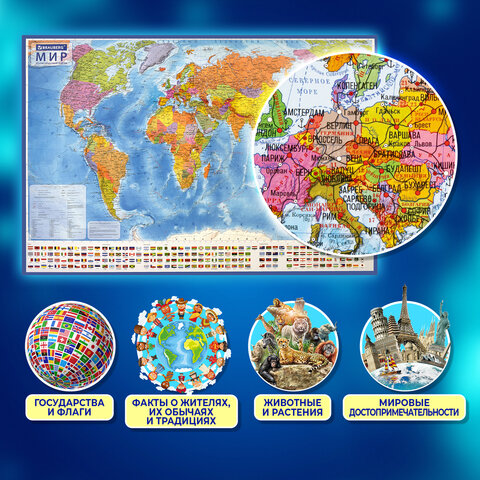 На политической карте мира BRAUBERG отображается современное политико-административное устройство мира: названия государств и их столицы, крупнейшие города и границы стран. Ниже расположены государственные флаги.