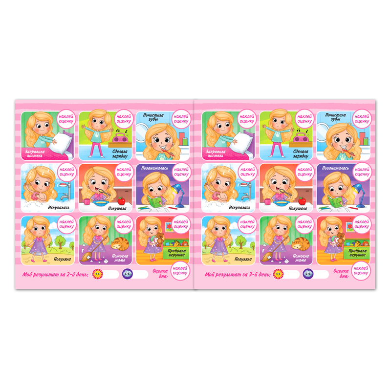 Данная книжка поможет в воспитании ребёнка, способствует развитию самостоятельности и ответственности. Книжка рассчитана на неделю, в течение которой вы должны следить за выполнением распорядка дня и приклеивать наклейки-оценки. Можно договориться с ребёнком о каком-то призе, который он получит в конце недели, если в его книжке будет больше солнышек, а не тучек.