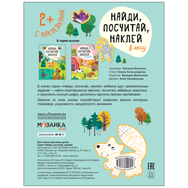 Все малыши любят стихи и легко усваивают ритмичную информацию. Именно поэтому задания на счёт в книге «В лесу» серии «Найди, посчитай, наклей» даны в стихотворной форме. Маленький читатель отправится в лес, познакомится с лесными животными и выполнит увлекательные задания: найдет спрятавшегося зайчонка, посчитает животных на странице и приклеит нужную цифру, дополнит картинку наклейками с забавными зверушками. Такие занятия способствуют развитию речевых способностей, внимания и памяти, мелкой моторики, мышления и логики; расширению кругозора.