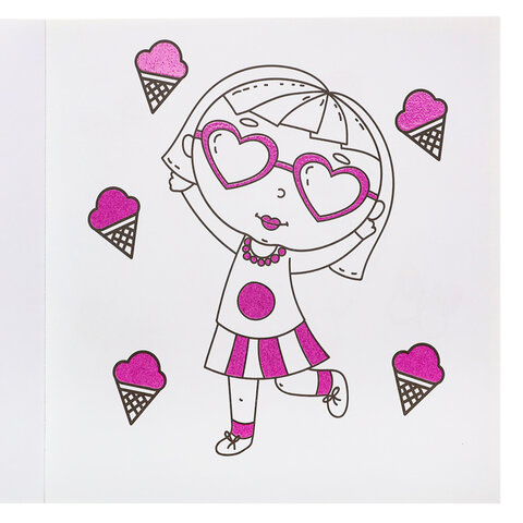 Раскраска состоит из 12 листов определенной тематики. Каждая страница украшена цветными блёстками.