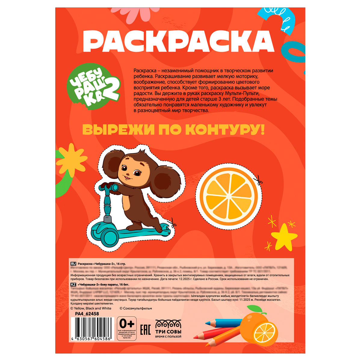 Раскраска формата А4 Три Совы серии «Чебурашка-2» отлично подойдет для того, чтобы занять ребенка интересным делом. Раскраска содержит 8 листов и 16 различных сюжетов с известным и любимым героем Чебурашкой. Листы раскраски выполнены на офсетной бумаге плотностью 100 г/м2. Для раскрашивания можно использовать карандаши, фломастеры, краски. Размер раскраски на скрепке – 210*290 мм.<br/>• Формат: А4;<br/>• Количество листов: 8;<br/>• Пол: универсальный.