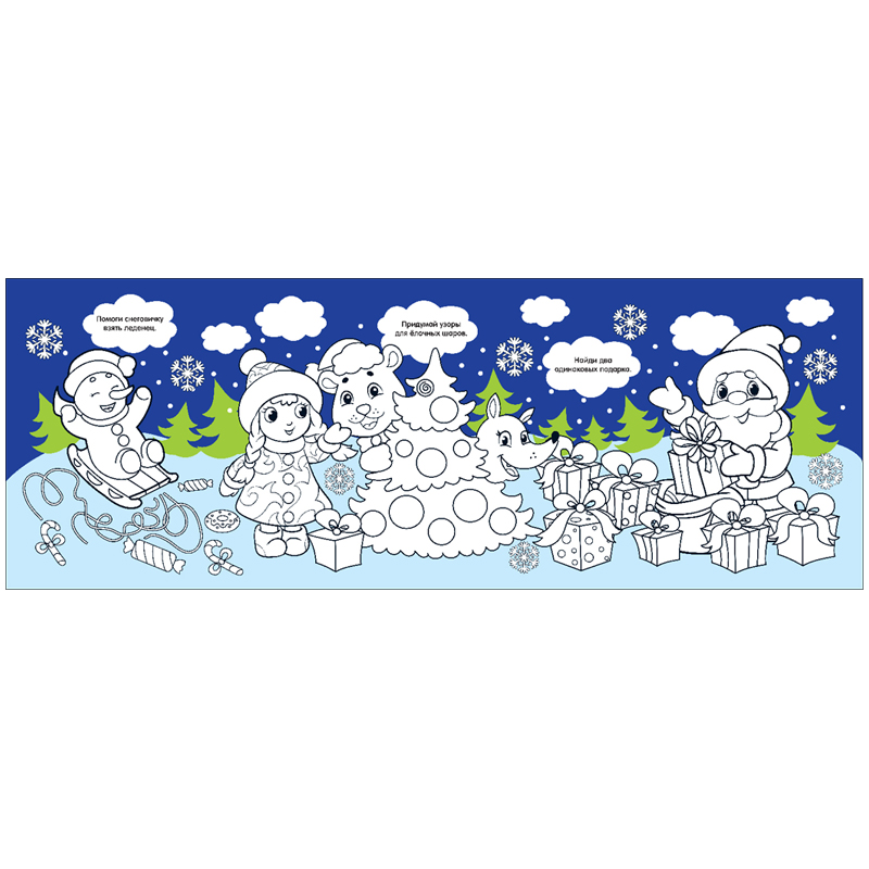 Книжку «Дед Мороз и Снегурочка» длиной в целый метр можно раскрашивать очень долго. В итоге получатся сказочные новогодние картины.