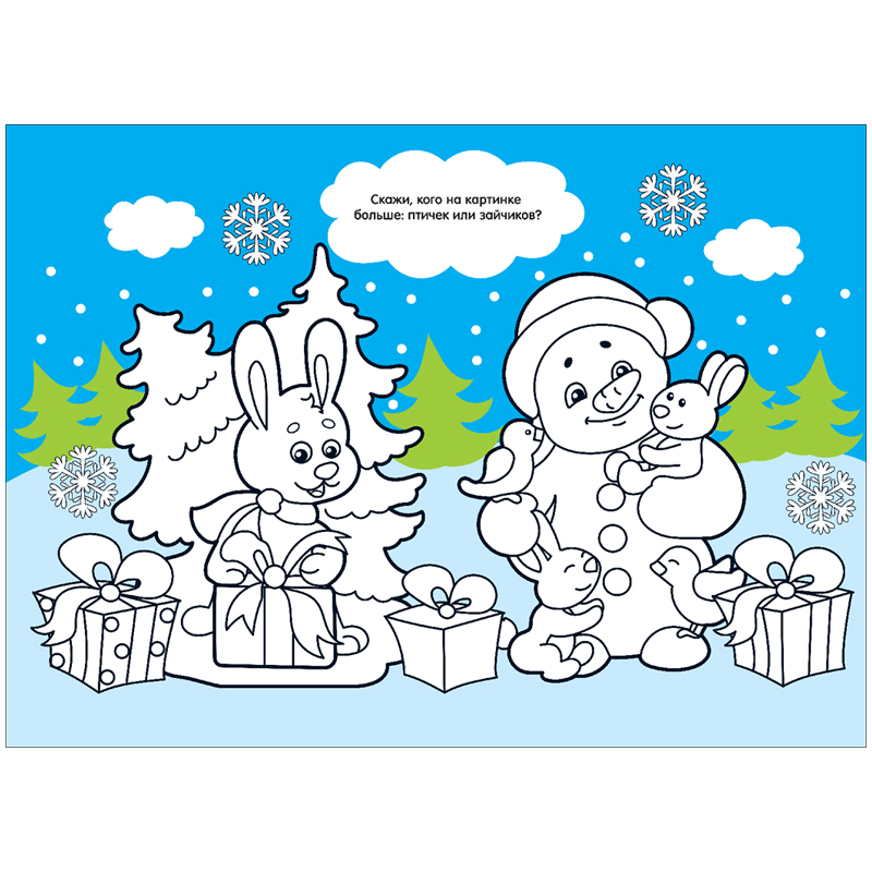 В книжке малыш встретит задания на внимание и воображение: придумает узоры для ёлочных шаров, найдёт два одинаковых подарка, сосчитает птичек и зайчиков. Изучайте вместе с ребёнком новогодние стишки и рассказывайте на утренниках и семейных праздниках.