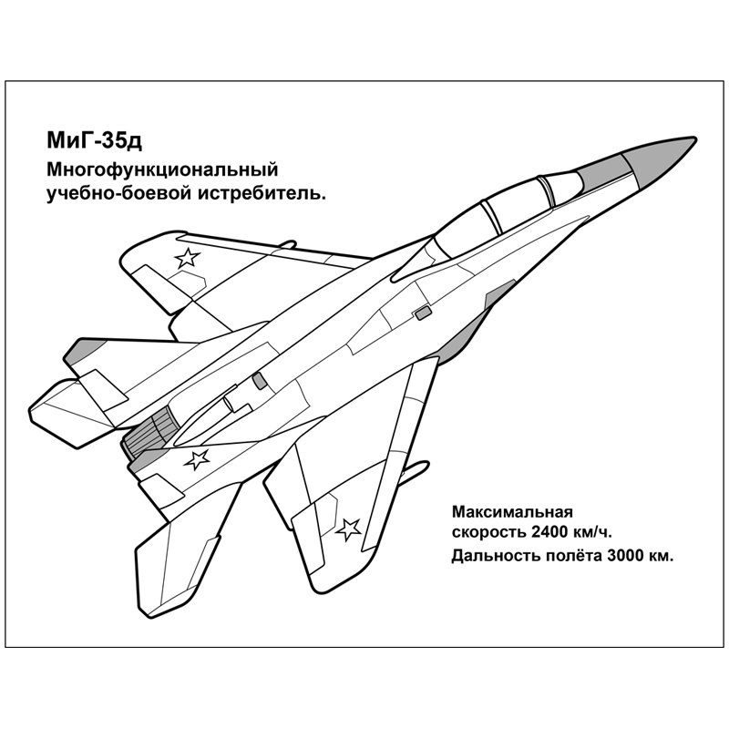 Развивающая раскраска для детей дошкольного и младшего школьного возраста. Восемь изображений для раскрашивания самых новых и известных моделей самолетов военно-воздушных сил РФ. С указанием названий и основных технических характеристик.