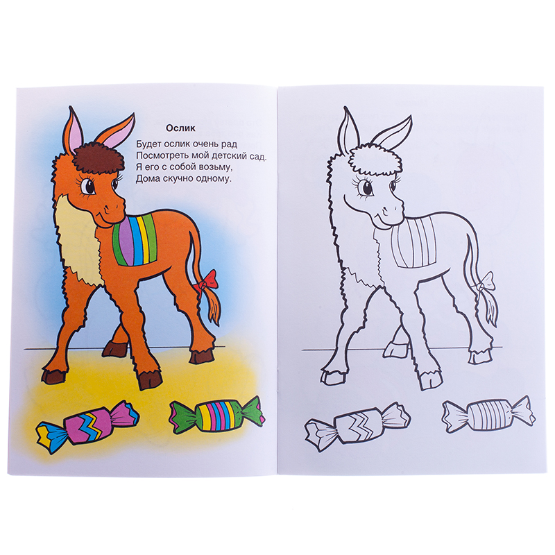 Раскраска для детей младшего возраста. Развивает моторику, память и творческие способности. Блок - офсетная бумага, 6 листов, на скрепке. Обложка - мелованный картон.