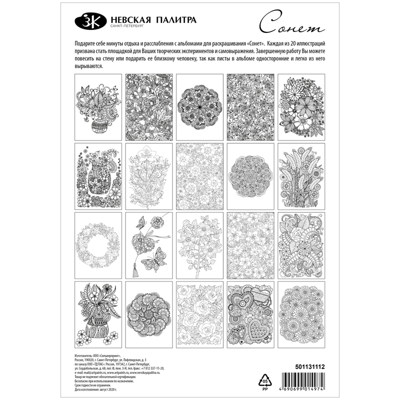 Подарите себе минуты отдыха и расслабления с альбомами для раскрашивания "Сонет". Каждая из 20 иллюстраций призвана стать площадкой для Ваших творческих экспериментов и самовыражения. Завершенную работу Вы можете повесить на стену или подарить ее близкому человеку, так как листы в альбоме односторонние и легко из него вырываются.<br/>Характеристики: <br/> - назначение: графика, смешанные техники;<br/> - состав: 100% целлюлоза;<br/> - плотность бумаги - 160 г/м²,<br/> - цвет - белый, нанесен контур рисунка;<br/> - формат - А4;<br/> - количество листов - 20; <br/> - тип крепления - склейка;<br/> - страна производства - Россия<br/> - упаковка - пакет с европодвесом;<br/><br/>Хранить в сухом месте.<br/>Срок годности не ограничен.<br/>Обязательной сертификации не подлежит.<br/>Производитель: ООО «Сильверпринт».