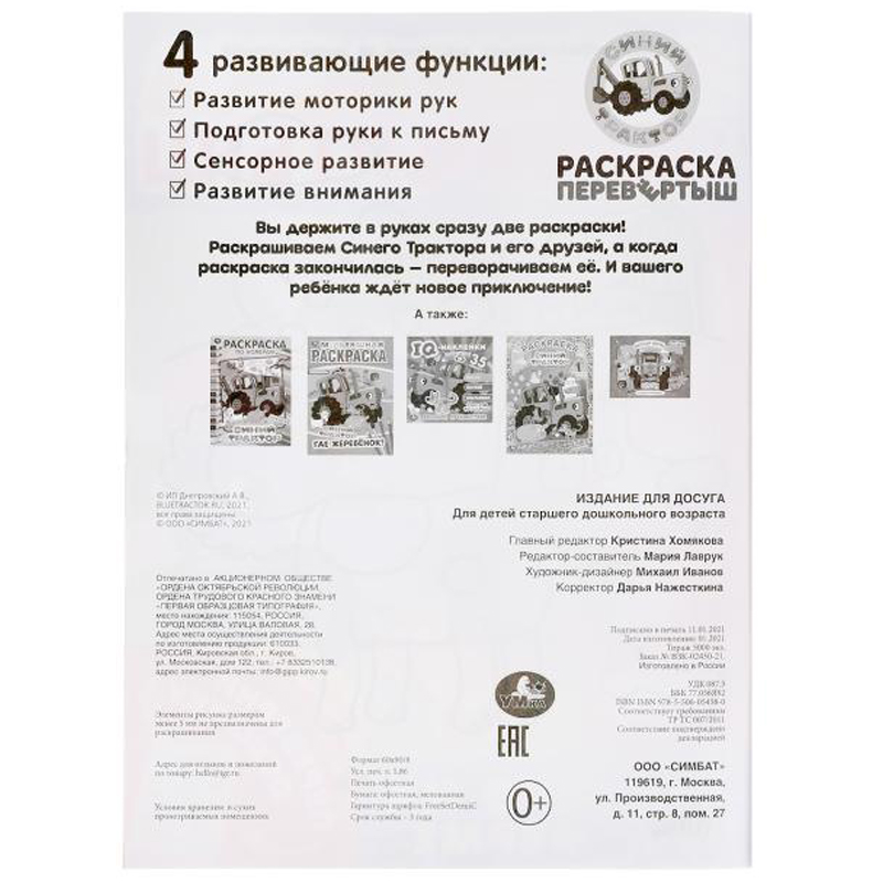 Раскраска-перевёртыш «Синий трактор. Утро на ферме» обязательно заинтересует ребёнка:<br/>- чёткий контур картинок для раскрашивания<br/>- необычный формат - переверни обложку<br/>- интересные и разнообразные иллюстрации<br/>- любимые персонажи<br/>- короткие комментарии к рисункам на каждой странице<br/><br/>Маленький поклонник мультсериала о приключениях весёлого Трактора будет рад встретиться с любимыми мультгероями на страничках этой необычной раскраски-перевёртыша. Вместе с ними ребёнок научится подбирать подходящие цвета и раскрашивать картинки, не выходя за контур, что поможет подготовить руку к письму. Благодаря удобному формату раскраску можно взять с собой в дорогу.<br/><br/>Игровые занятия с раскраской ТМ «УМка» способствуют развитию:<br/>- мелкой моторики рук<br/>- памяти<br/>- речи<br/>- внимания<br/>- творческого мышления<br/>- усидчивости<br/><br/>Объём: 16 стр. Формат: 214 x 290 мм.<br/>Материал: офсетная бумага.<br/>Рекомендовано детям старшего дошкольного возраста.
