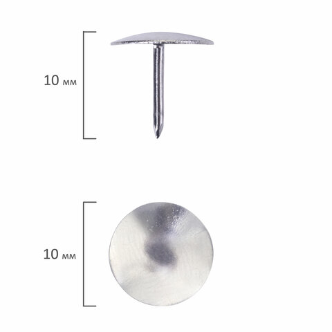 Кнопки со стальной шляпкой диаметром 10 мм и стальным острием длиной 10 мм. 50 штук в картонной коробке.