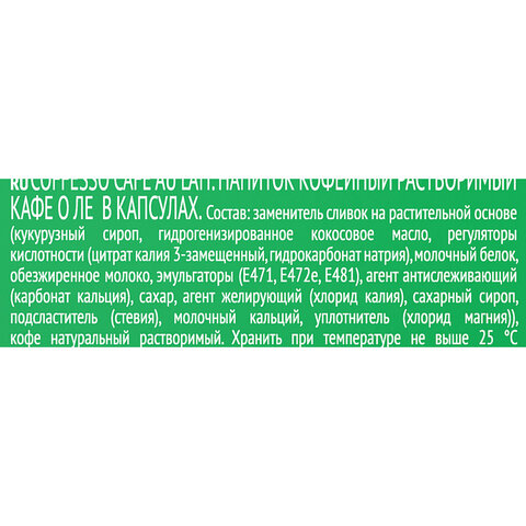 Состав: заменитель сливок на растительной основе (кукурузный сироп, гидрогенизированное кокосовое масло, регуляторы кислотности (цитрат калия 3-замещенный, гидрокарбонат натрия), молочный белок, обезжиренное молоко, эмульгаторы (E471, E472e, E481), агент антислеживающий (карбонат кальция), сахар, агент желирующий (хлорид калия), сахарный сироп, подсластитель (стевия), молочный кальций, уплотнитель (хлорид магния)), кофе натуральный растворимый
