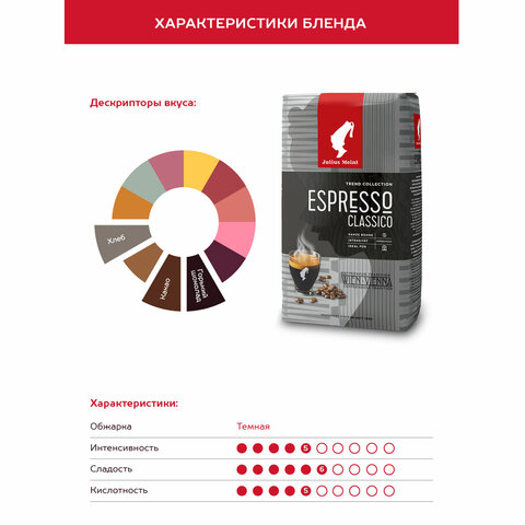 Кофе в зернах "Espresso Classico Trend Collection" представляет собой комбинацию отборных сортов кофе из Южной и Центральной Америки и Азии - смесь интенсивного кофе как по аромату, так и по вкусу. Оттенки аромата напоминают поджаренный хлеб.