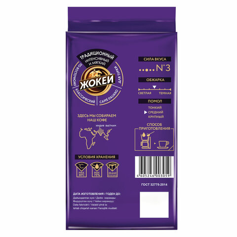 Помол кофе «Жокей» Традиционный одинаково подходит для использования в кофеварке и для приготовления в турке или кофейнике. Состав: Арабика Бразилия, Уганда, Индия. Интенсивность вкуса: 3