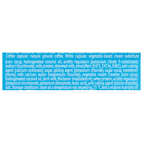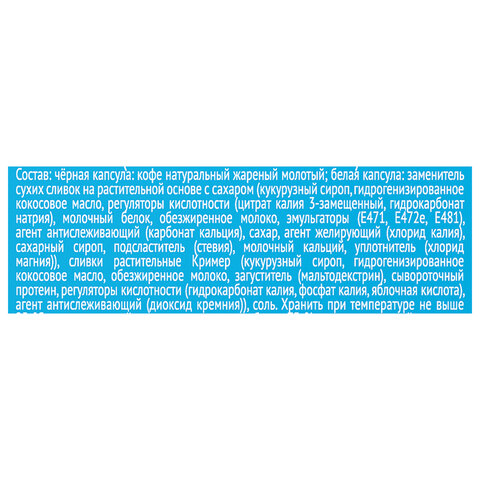 Состав: кофе жареный молотый, заменитель сливок на растительной основе (кукурузный сироп, гидрогенизированное кокосовое масло, регуляторы кислотности (цитрат калия 3-замещенный, гидрокарбонат натрия), молочный белок, обезжиренное молоко, эмульгаторы (E471, E472e, E481), агент антислеживающий (карбонат кальция), сахар, агент желирующий (хлорид калия), сахарный сироп, подсластитель (стевия), молочный кальций, уплотнитель (хлорид магния)), сливки растительные "Кример" (кукурузный сироп, гидрогенизированное кокосовое масло, обезжиренное молоко, загуститель (мальтодекстрин), сывороточный протеин, регуляторы кислотности (гидрокарбонат калия, фосфат калия, яблочная кислота), агент антислеживающий (диоксид кремния)), ароматизатор.