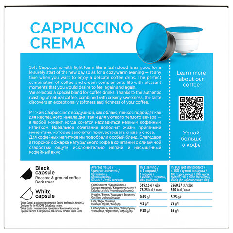 Мягкий "Сappuccino Crema" с воздушной, как облако, пенкой подойдёт как для неспешного начала дня, так и для уютного тёплого вечера – в любой момент, когда хочется насладиться нежным кофейным напитком.