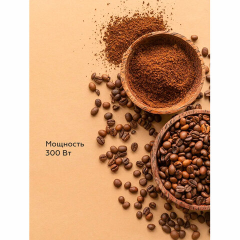 Электрическая кофемолка оснащена двигателем мощностью 300 Вт, емкость для загрузки вмещает до 50 г зерен.