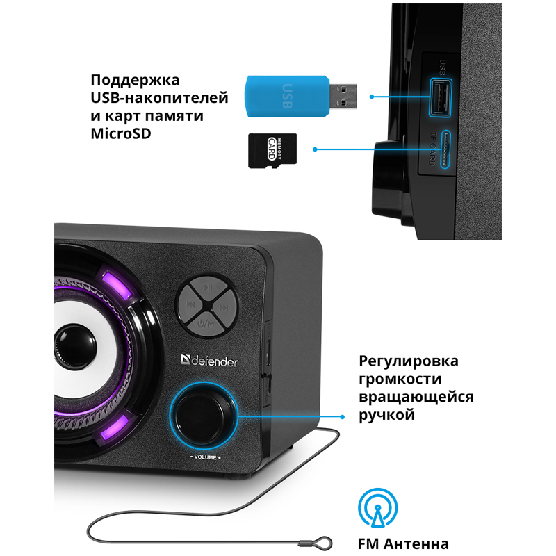 Bluetooth 5.0<br/>Светодиодная подсветка<br/>Поддержка USB-накопителей и MicroSD-карт<br/>Наличие слота для карт памяти стандарта Micro-SD или USB дает возможность воспроизведения музыкальных файлов без использования компьютера. Достаточно вставить в слот карту с записанными на ней WAV- или MP3-файлами – и можно наслаждаться музыкой.<br/>Встроенный MP3-плеер<br/>Встроенный FM-приемник<br/>Встроенный тюнер превращает колонку в полноценный радиоприемник. Вы всегда сможете послушать ваши любимые радиопередачи или музыку.