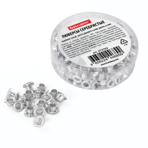 Люверсы BRAUBERG, КОМПЛЕКТ 250 шт., внутренний диаметр 4,8 мм, длина 4,6 мм, серебристые, 227794