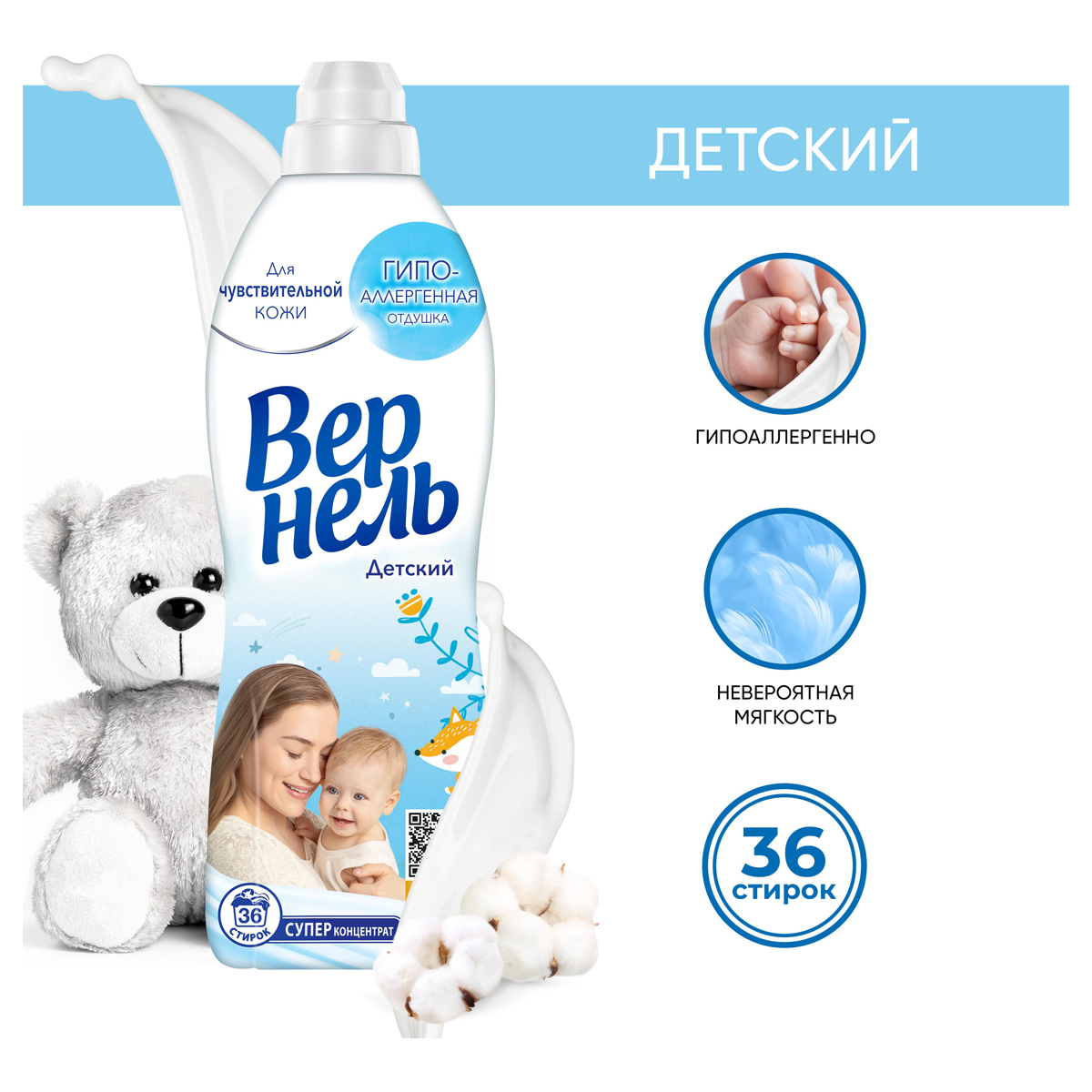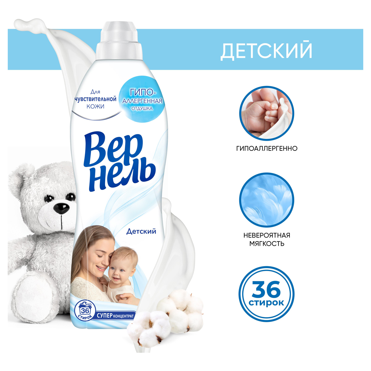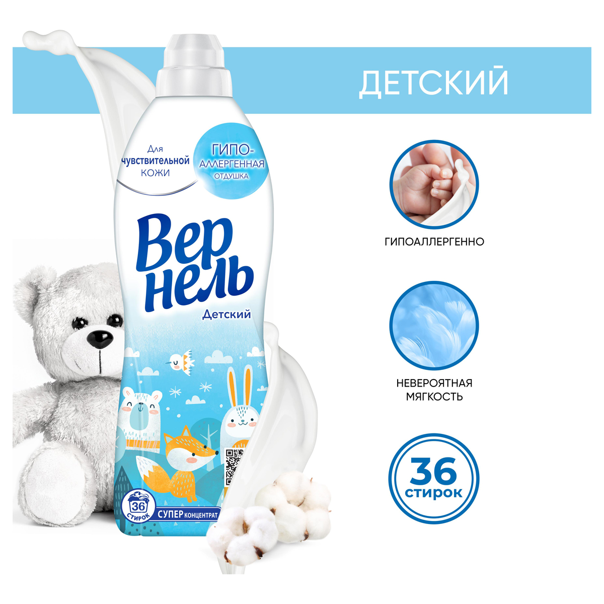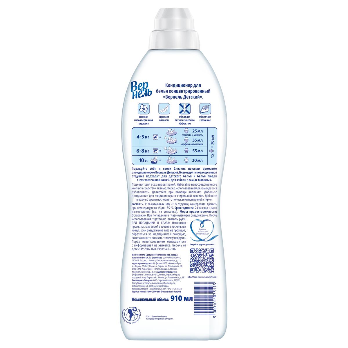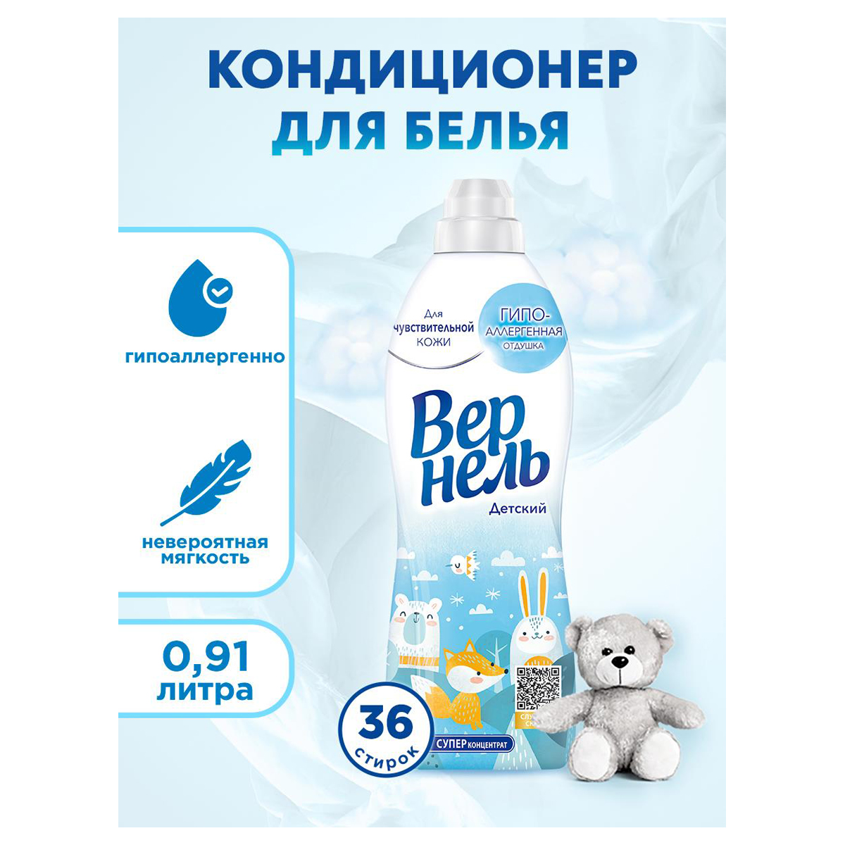 Концентрированный кондиционер для белья Вернель Детский 910 мл, 30 стирок предназначен для стирки детского белья, а также одежды людей с чувствительной кожей и склонных к аллергии.<br/>Почему многие мамы отдают предпочтение Кондиционеру Вернель для детей?<br/>- Кондиционер Вернель Детский придает белью невероятную мягкость и свежесть.<br/>- Средство Вернель Детский подходит для стирки вещей для людей с чувствительной кожей и склонных к аллергии.<br/>- Гипоаллергенная отдушка. Проверено ECARF.<br/>- Средство Вернель Детский обладает мягким нейтральным ароматом.<br/>- Кондиционер для стирки облегчает глажку, а также обладает антистатическим эффектом.<br/>- Средство Вернель благодаря высокой концентрации очень экономично расходуется: на одну стирку достаточно меньше половины колпачка. Поэтому концентрированного средства для полоскания хватает на длительное время.<br/>- Благодаря удобной крышке-дозатору вы всегда будете знать, сколько ополаскивателя для белья необходимо добавить.