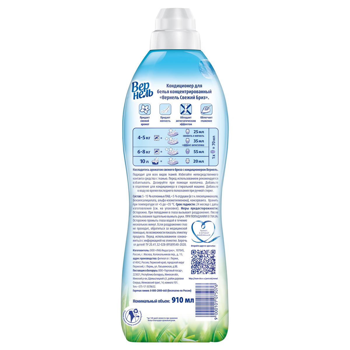 Концентрированный кондиционер для белья Вернель Свежий Бриз 910 мл, (36 стирок) подарит белью не только невероятную мягкость, но и легкий пробуждающий аромат.<br/> Преимущества кондиционера для белья Вернель:<br/> - Средство Вернель имеет концентрированную формулу, обеспечивающую мягкость и свежесть белью.<br/> - Благодаря специальным аромакапсулам в составе кондиционер для стирки Вернель позволит наслаждаться интенсивным ароматом белья до 140 дней. <br/> - Кондиционер для стирки облегчает глажку и обладает антистатическим эффектом.<br/> Кондиционер Вернель идеально подходит для регулярного ухода за бельем, благодаря эффективности и простоте использования.<br/> - На одну стирку достаточно меньше половины колпачка средства Вернель.<br/> - Благодаря удобной крышке-дозатору вы всегда будете знать, сколько ополаскивателя для белья необходимо добавить в отделение для кондиционера в стиральной машине или в воду во время последнего полоскания при ручной стирке.