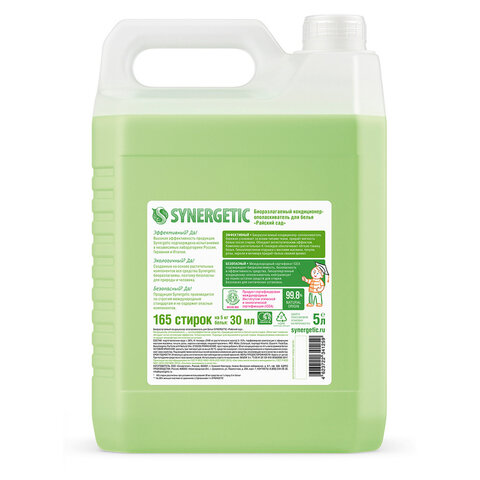 Биоразлагаемый кондиционер-ополаскиватель для белья SYNERGETIC "Райский сад" – высокоэффективное средство, бережно ухаживающее за всеми типами ткани, в том числе деликатными, и придающее особую мягкость и нежность белью после стирки. Гипоаллергенный кондиционер-ополаскиватель нейтрализует остатки средств для стирки на ткани, помогает сохранить структуру ткани, защищая волокна от изнашивания и повреждения. Средство обладает антистатическим эффектом. Комплекс растительных К-тензидов обеспечивает легкую глажку белья после стирки и высыхания. Гипоаллергенная парфюмерная композиция с эфирными маслами жасмина, пачули, розы, нероли и ветивера придает белью нежный и приятный аромат. Подходит для ручной и машинной стирки, полностью выполаскивается из тканей. Международный экологический сертификат ICEA подтверждает биоразлагаемость, безопасность и эффективность средства. Биоразлагаемые компоненты не вредят микрофлоре септических установок.
