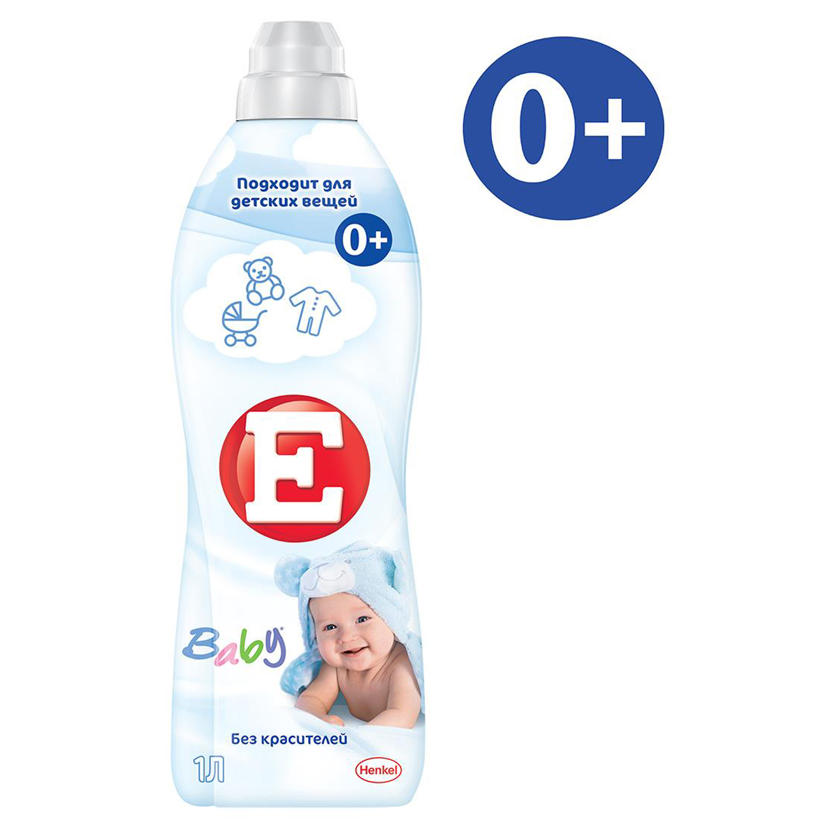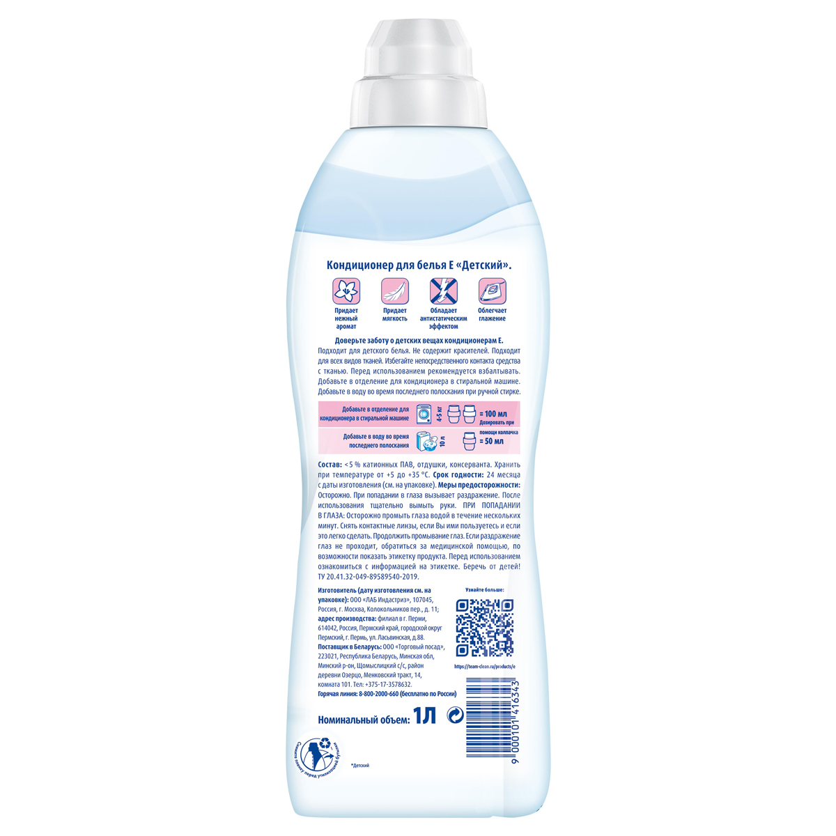 Кондиционер для белья Е Детский 1000 мл бережно и деликатно ухаживает за детской одеждой. Благодаря современной щадящей формуле из катионных ПАВ и глицерина кондиционер обладает эффективными преимуществами.<br/> - Благодаря кондиционеру белье будет мягким и приятным для кожи ребенка.<br/> - Средство для ополаскивания детских вещей дарит белью свежесть и приятный аромат, который сохраняется длительное время.<br/> - Кондиционер Детский облегчает глажку и обладает антистатическим эффектом.<br/> Почему современные мамы отдают предпочтение детскому средству для белья?<br/> - Кондиционер универсально подходит для ополаскивания всех видов тканей. <br/> - Средство для ополаскивания белья можно использовать при машинной и ручной стирке. <br/> - Все рекомендации по эффективному использованию кондиционера можно прочитать на упаковке.<br/> - Кондиционер не вызывает аллергии и раздражений на чувствительной детской коже.<br/> С кондиционером для детей вещи будут всегда мягкими и приятными на ощупь.