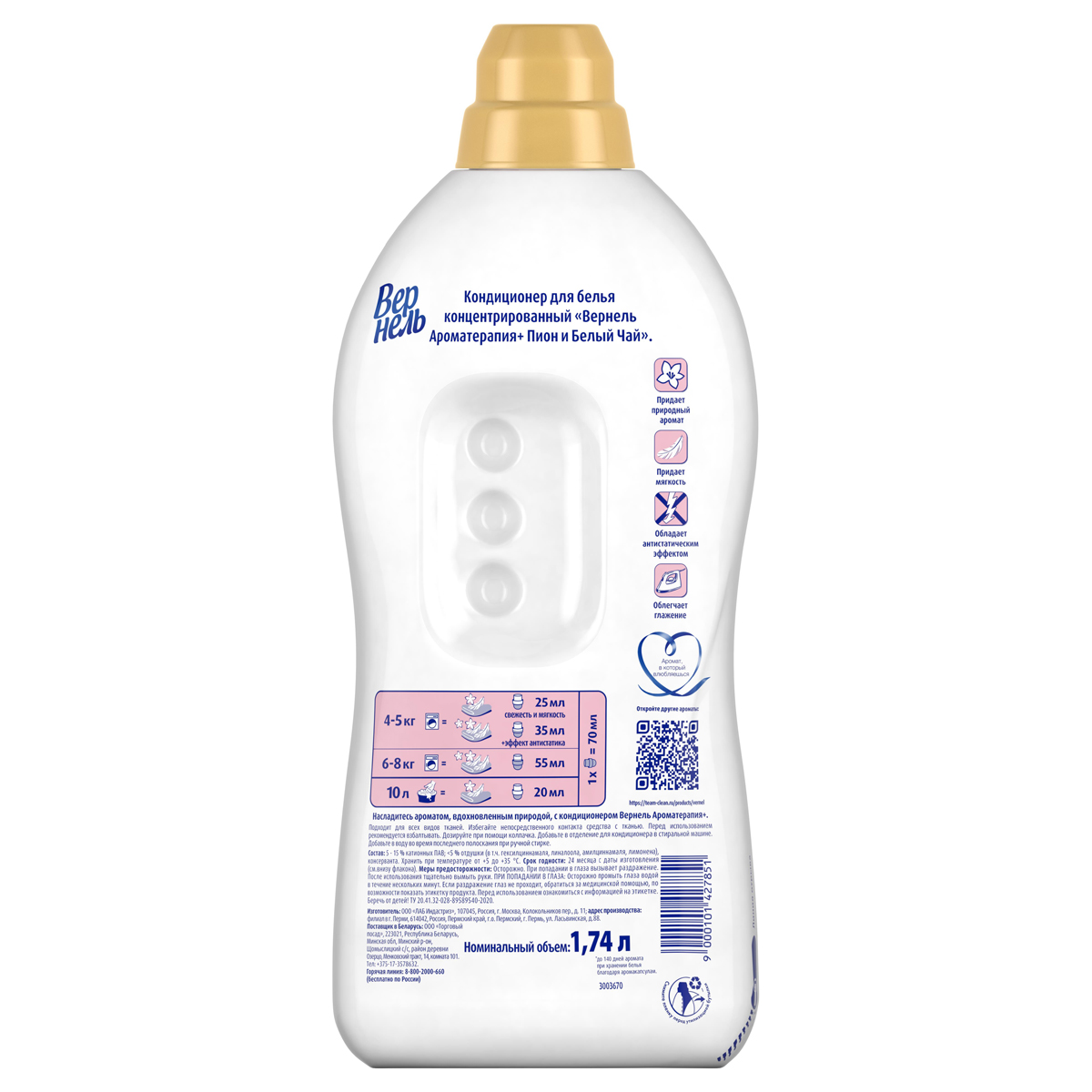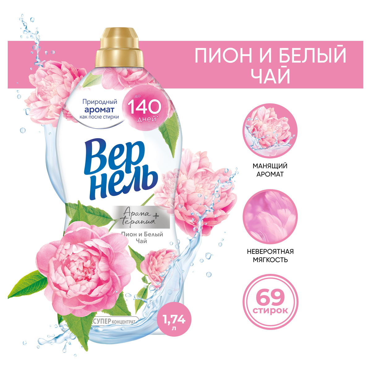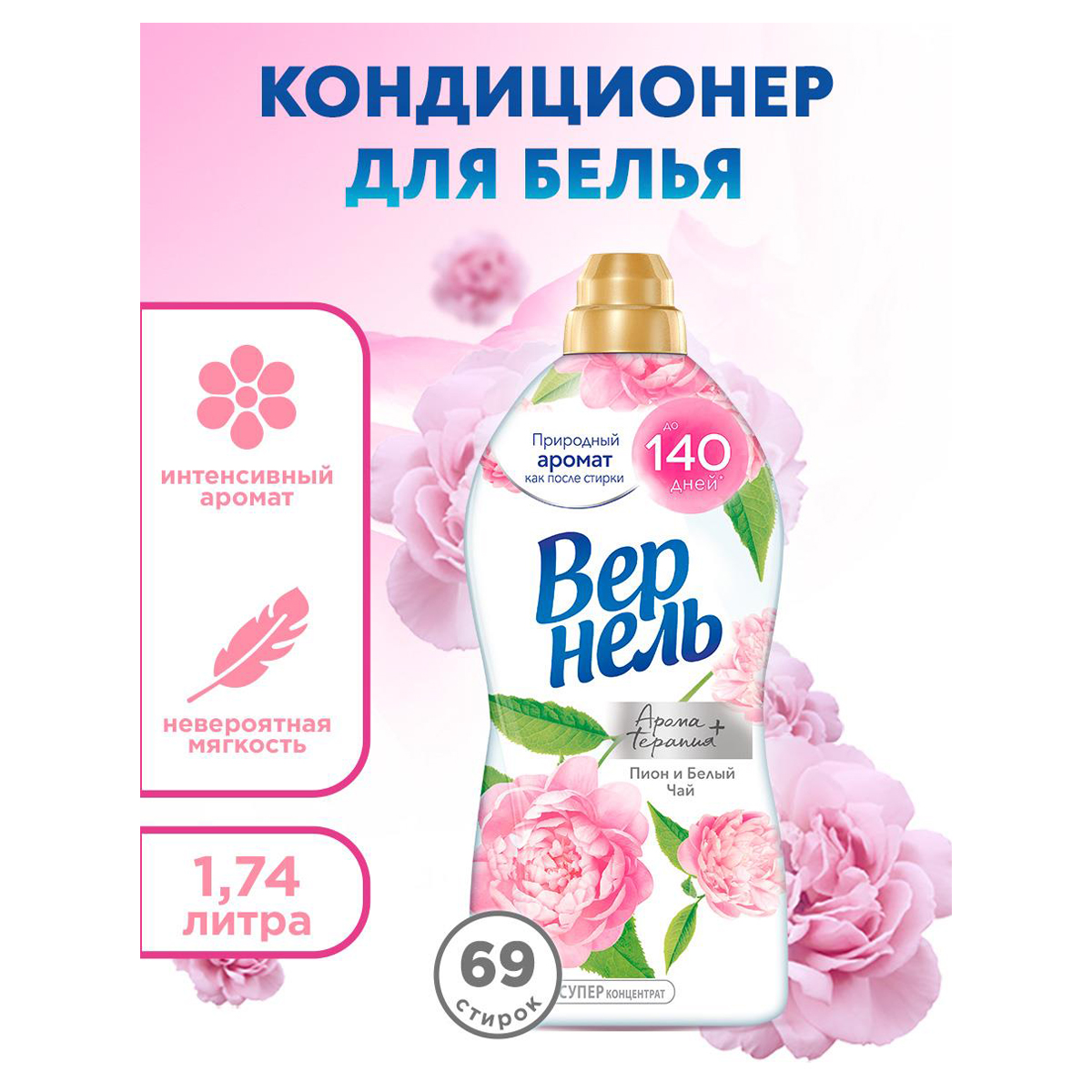 Концентрированный кондиционер для белья Вернель Ароматерапия+ Пион и Белый Чай 1740 мл (69 стирок) подарит Вашему белью нежный, расслабляющий аромат, вдохновленный самой природой. Благодаря специальным аромакапсулам кондиционер для стирки Вернель позволит наслаждаться интенсивным ароматом до 140 дней. Кондиционер для белья Вернель Ароматерапия+ отвлечет Вас от повседневных забот с ароматом пиона, белого чая и нотками кедра и мускуса.<br/>Преимущества кондиционера для белья Вернель: <br/>-кондиционер для белья обеспечивает аромат до 140 дней (при хранении белья без использования) <br/>-кондиционер для стирки придает приятный аромат и мягкость белью <br/>-кондиционер для стирки облегчает глажку и обладает антистатическим эффектом <br/>-обладает насыщенным букетом ароматов: от мускуса и кедра до яркого пиона и белого чая <br/>-на одну стирку достаточно меньше половины колпачка <br/>Подходит для всех видов тканей. <br/>Избегайте непосредственного контакта средства для стирки с тканью.