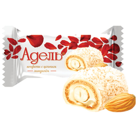 АККОНД "Адель" – это конфеты в вафельном корпусе, с кремовой начинкой и цельным миндалём. Покрыты белой глазурью и обсыпаны кокосовой стружкой.