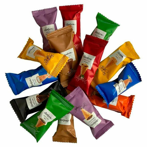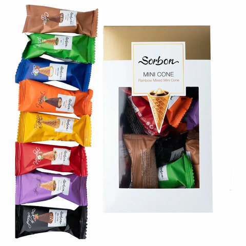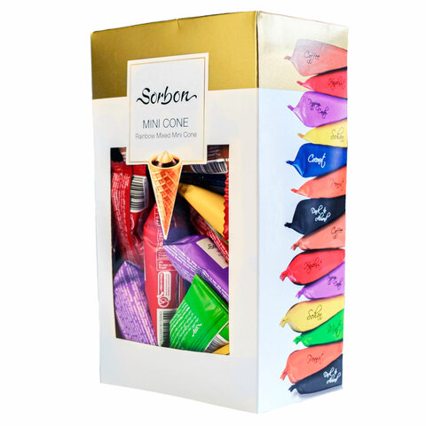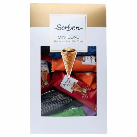 Мини-рожки ассорти SORBON "Ассорти Радуга" - это хрустящие вафельные рожки и нежные, невероятно вкусные начинки: кофе, мята, кокос, арахис, сохан, фундук, стреляющая карамель, миндаль в подарочной оригинальной упаковке.