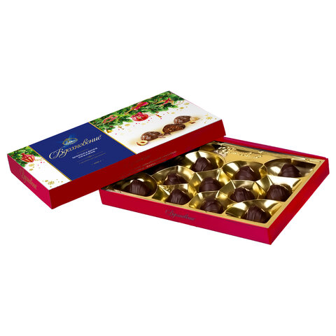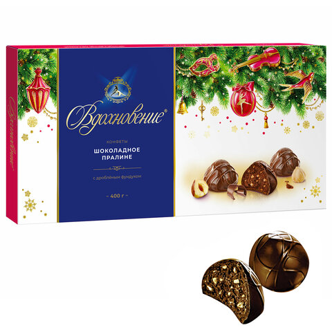 "Вдохновение" - это набор куполообразных конфет в шоколадной глазури. Корпус - шоколадно-ореховое пралине с дробленым фундуком.
