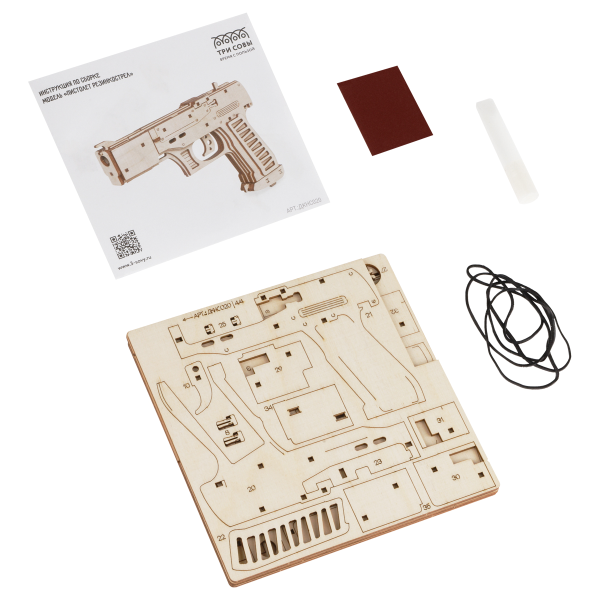 Экологически чистый и качественный конструктор «ТРИ СОВЫ» собирается с минимальным использованием клея. Наборы будут интересны не только малышам, но и взрослым. Размер готового изделия (мм): 185*27*130. Количество деталей: 58. Конструктивные особенности: собранная модель стреляет резинками, достается обойма. Конструктор способствует развитию мелкой моторики и предметному моделированию, а также воображению, пространственному мышлению и логики. Вы приятно проведёте время за сборкой, а готовая модель послужит не только игрушкой, но и стильным украшением интерьера!