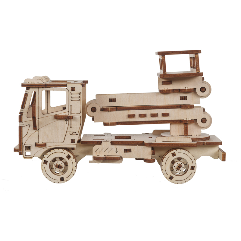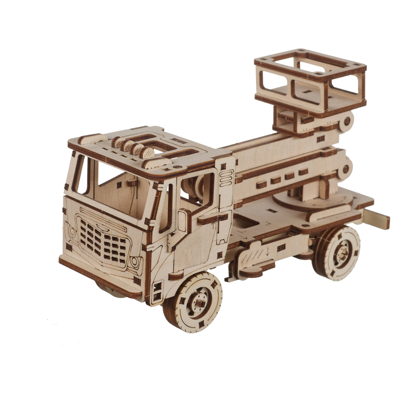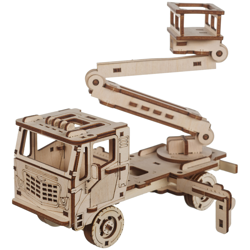 Конструктор 3D деревянный, подвижный "Автовышка" бежевого цвета марки TADIWOOD. Модель Автовышки многофункциональна: вращаются колеса, откидывается кабина, открываются люк и двери кабины, имеет раздвижной и вращающийся подъемник с монтажной площадкой, оснащена выдвижными опорными аутригерами. Машина ездит по любой поверхности.