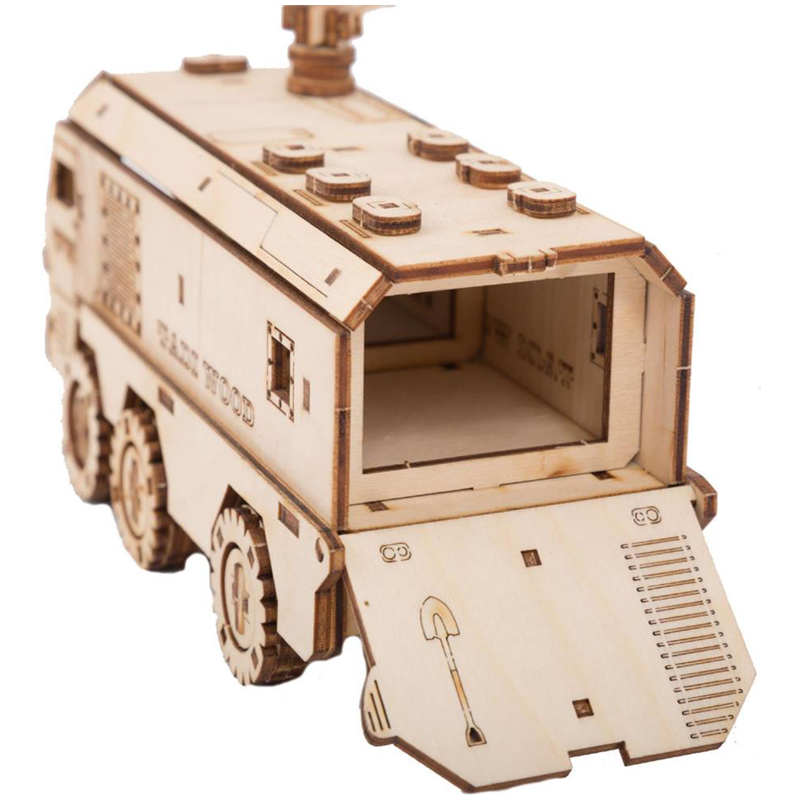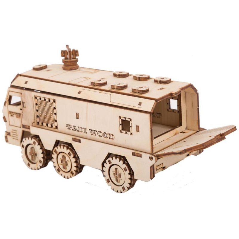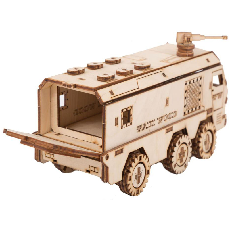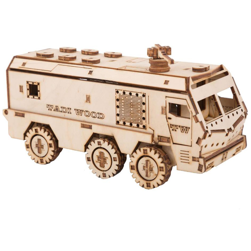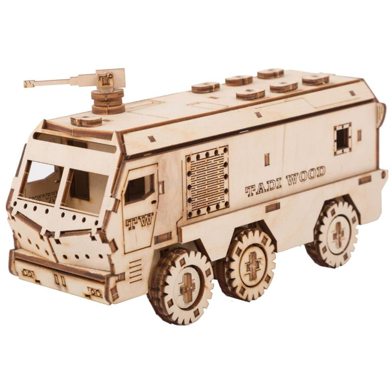 Конструктор 3D деревянный, подвижный "Бронемобиль" бежевого цвета марки TADIWOOD.<br/>Конструктор из дерева или как его еще называют 3D конструктор или 3D пазл, собирается полностью без клея и специального инструмента. Все элементы легко и прочно соединяются друг с другом. Конструктор можно раскрасить любыми красками, фломастерами или карандашами, проявив при этом свой дизайнерский потенциал.<br/><br/>Конструктор выполнен из высококачественной березовой фанеры 1 сорта. Насыщенный запах дерева добавляет приятных эмоций во время сборки.<br/><br/> В комплект входит: все необходимые детали конструктора, подробная инструкция для сборки.<br/><br/> У собранной модели Бронемобиля вращаются колеса, открывается дверь в салон, подвижный пулемет. Машина ездит по любой поверхности.<br/><br/>Сборка модели порадует не только детей, но и взрослых любителей моделизма.<br/><br/>Конструкторы от TADIWOOD помимо развлекающей функции имеют развивающую функцию - это отличная тренировка усидчивости, внимательности, а также развитие глазомера, мелкой моторики рук, пространственного и логического мышления.