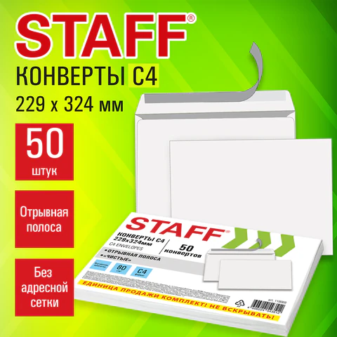 Конверт почтовый STAFF формата С4 предназначен для рассылки документов, журналов и и другой корреспонденции формата А4 без сложения.