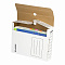 Изготовлен из белого гофрокартона марки Т-23, профиль «E». Толщина картона - 1,5 мм. Вмещает до 700 листов. Выдерживает до 4 кг. Размер короба - 32,5x7,5x26 см. Имеет откидную крышку и отверстия по бокам для удобства переноски. Поставляется в разобранном виде.