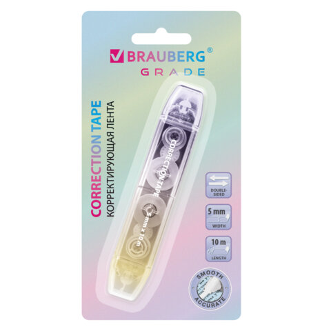 Корректирующая лента BRAUBERG "GRADE PASTEL" позволяет экономить время на исправлении текста, быстро высыхает после нанесения, не оставляет следов и черных полос на документе при копировании или отправке по факсу. Плотное и равномерное покрытие. Идеально поместится в школьный пенал. Поставляется в блистере с европодвесом.