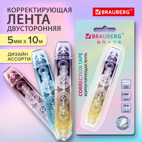 Корректирующая лента двусторонняя BRAUBERG GRADE PASTEL, 5 мм x 10 м, КОМПЛЕКТ 3 штук, 273026