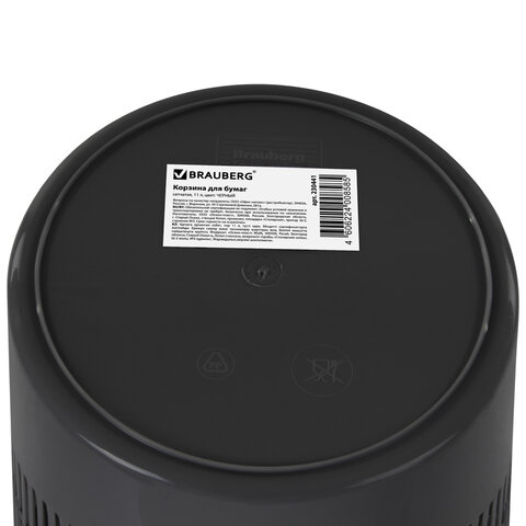 Изготовлена из высококачественного пластика черного цвета. Корпус расширяется к верху: диаметр основания составляет 18,5 см, а диаметр верхней части - 26 см. Высота - 29 см, объем - 11 л. Легкость и компактность корзины позволяют перемещать её с одного места на другое. Корзина удобно помещается под рабочим столом. Рекомендуемый размер мешка для мусора - 45х56 см, объем - до 18 литров.